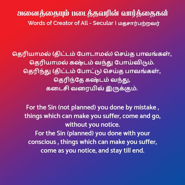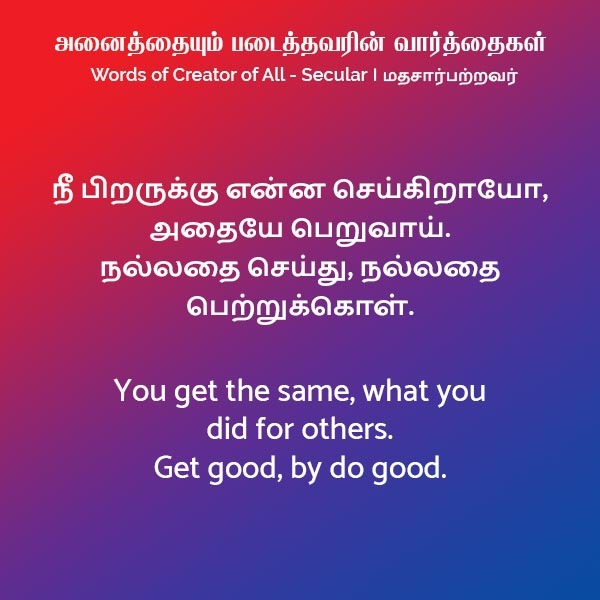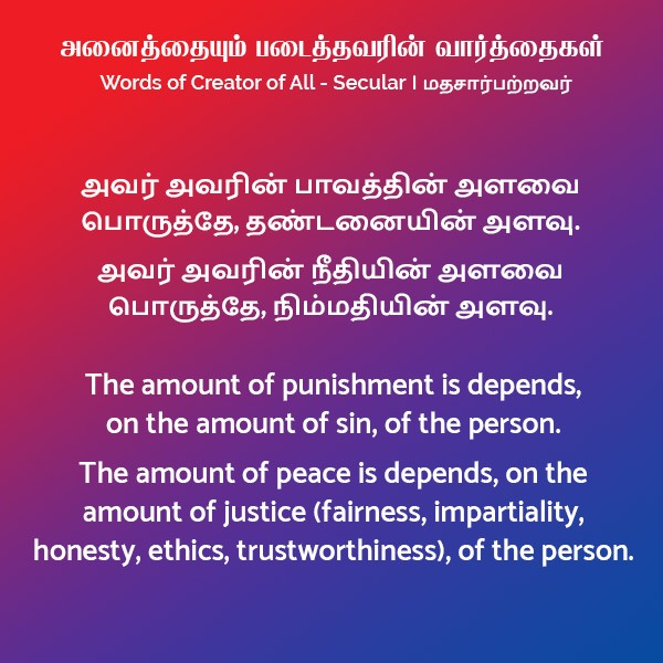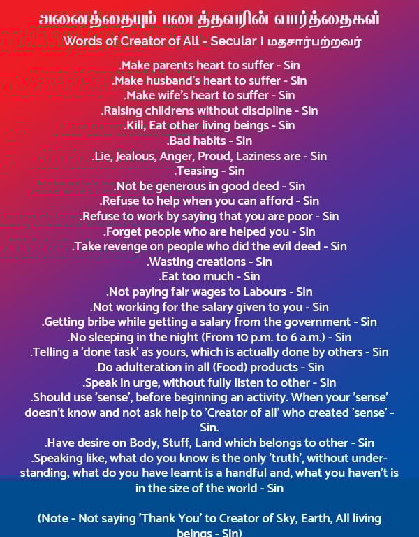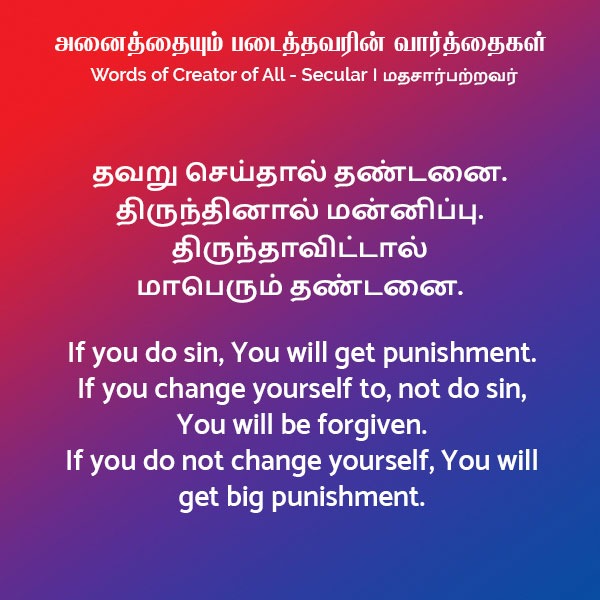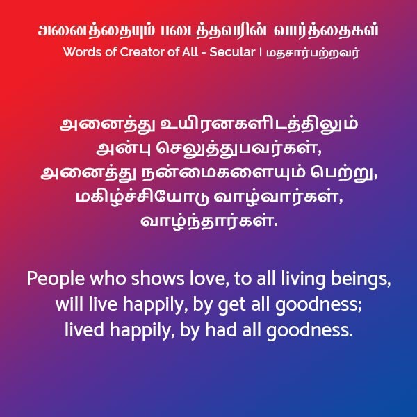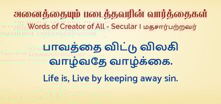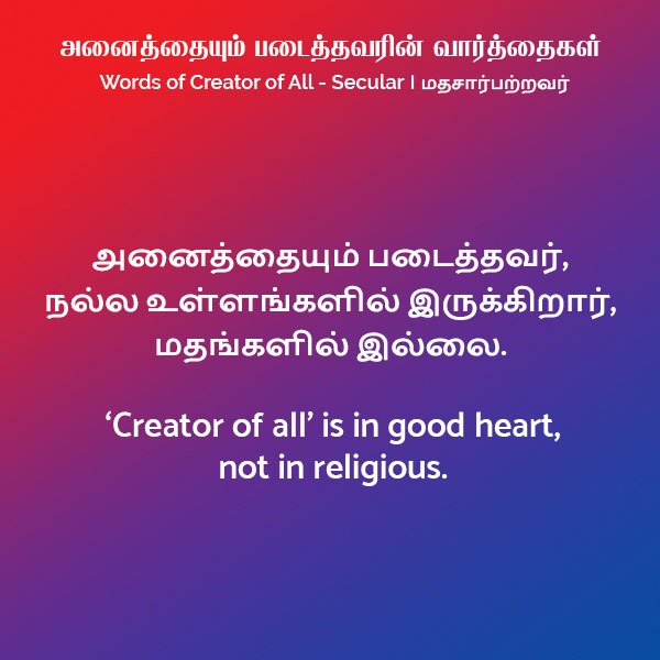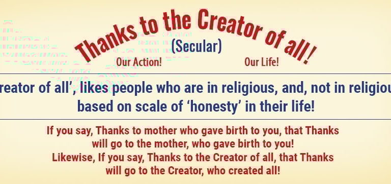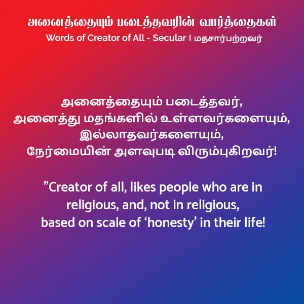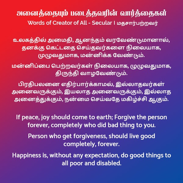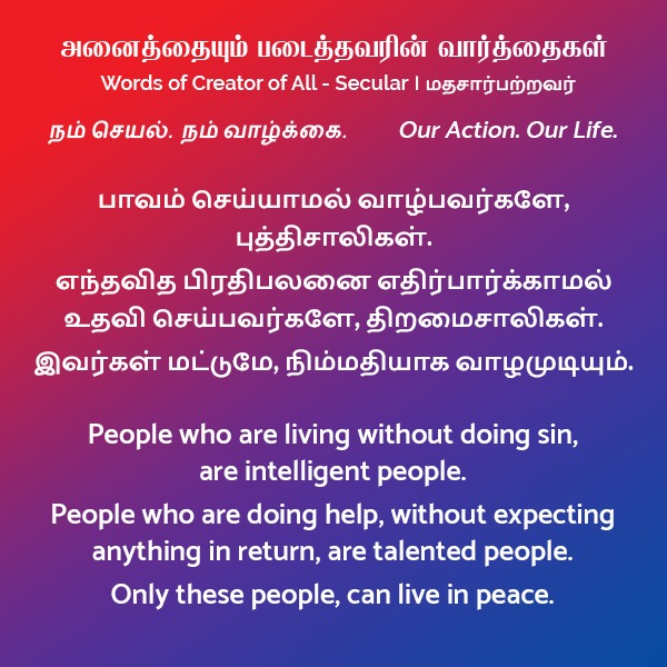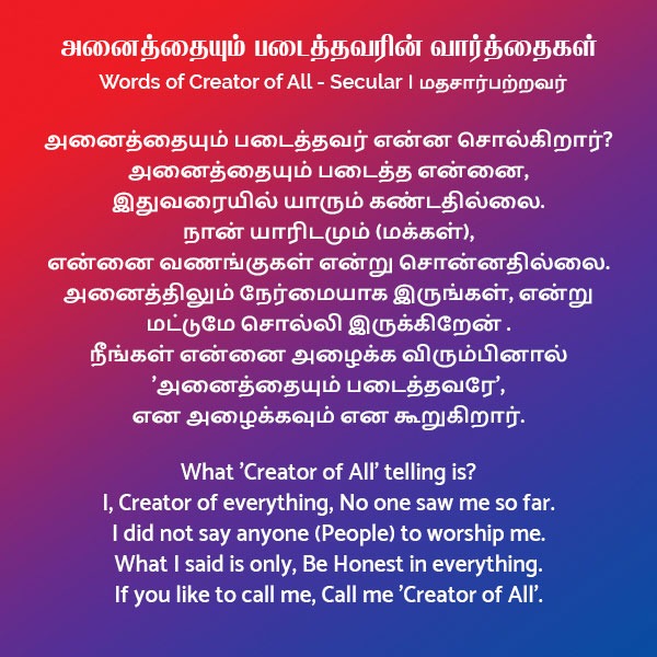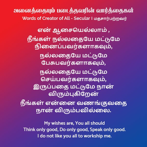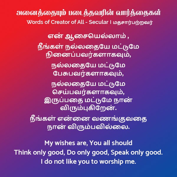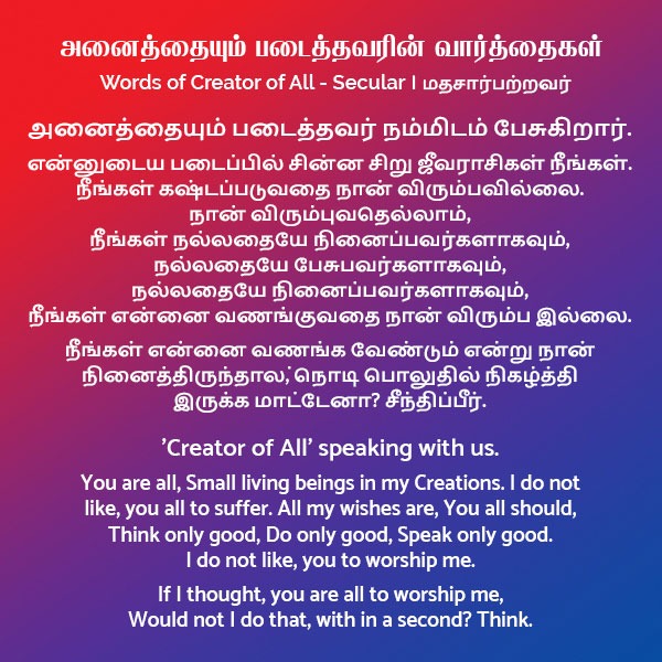 The 'Creator of All' (Secular) does not ask people to worship instead truly want is for people to live together with honesty. 'Creator of All' has given rain, air, and light freely to all living beings without any difference. This is a blessing for every human and every creature show thanks by living together in peace. The'Creator of all' (Secular) wants everyone to help each other as much as possible, without expecting anything in return—living with honesty, happiness, and unity. With honest people, the 'Creator of All' (Secular) stays as a companion in every situation. Those who correct themselves and choose to live as good people are forgiven, and their good wishes are supported. The 'Creator of all' (Secular) has given knowledge to everyone. But if someone uses that knowledge in the wrong way and keeps doing bad things, the 'Creator of all' (Secular) will not help them—and that is the truth.