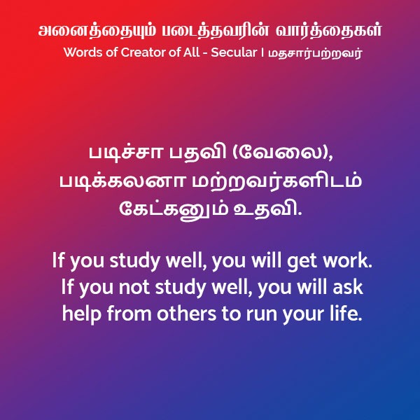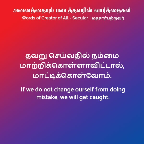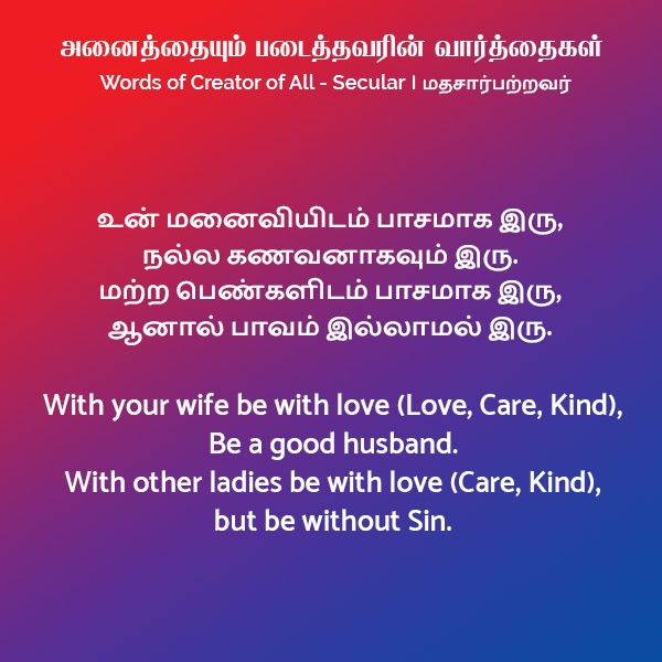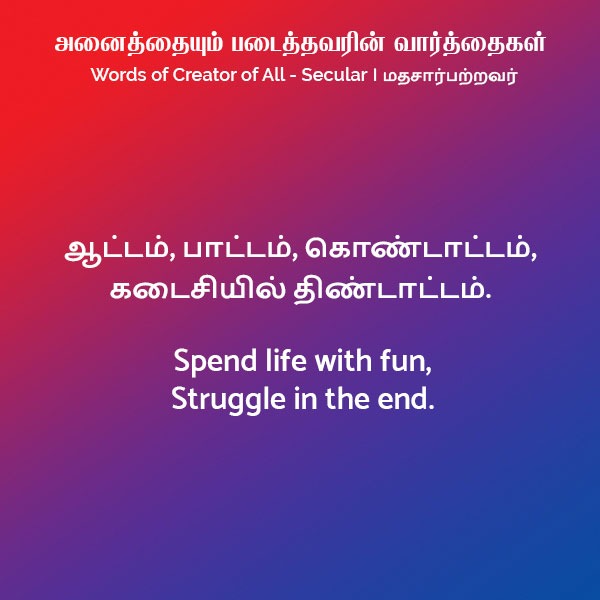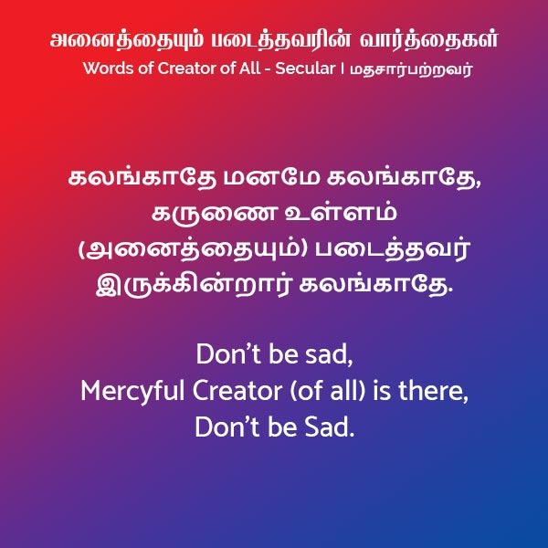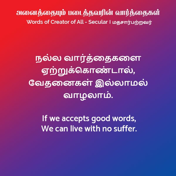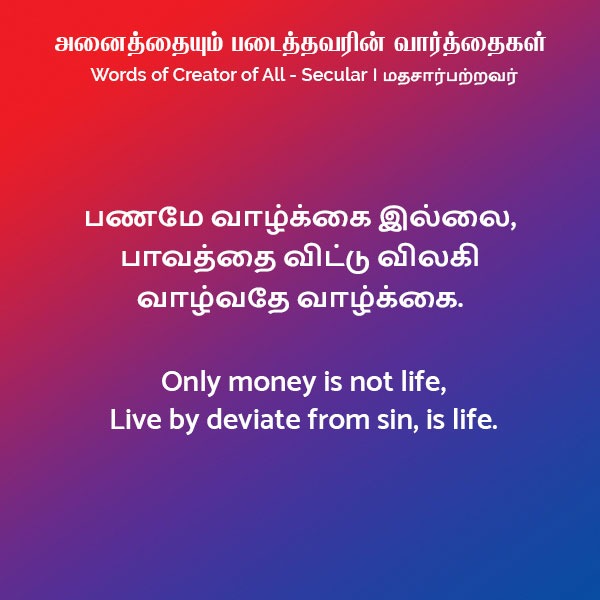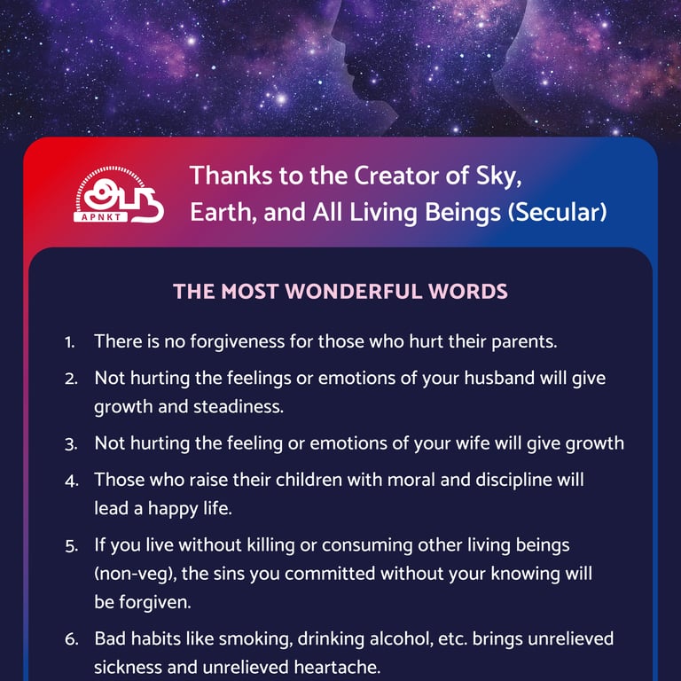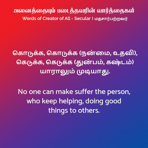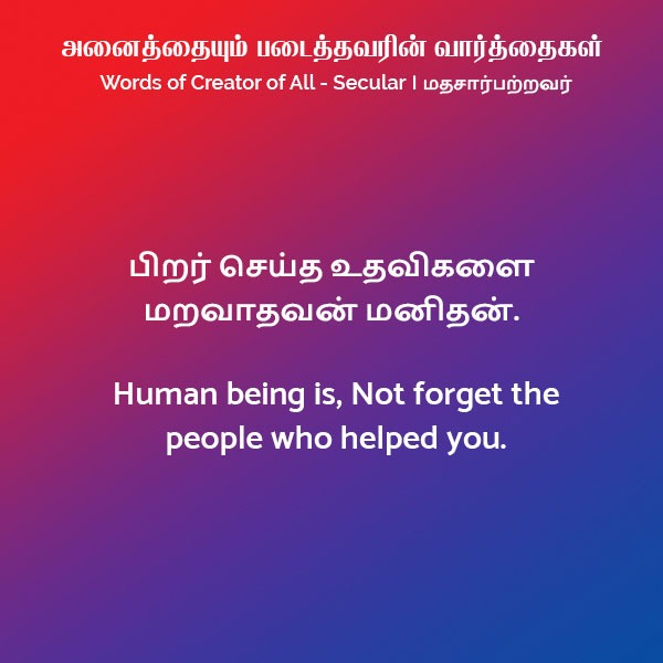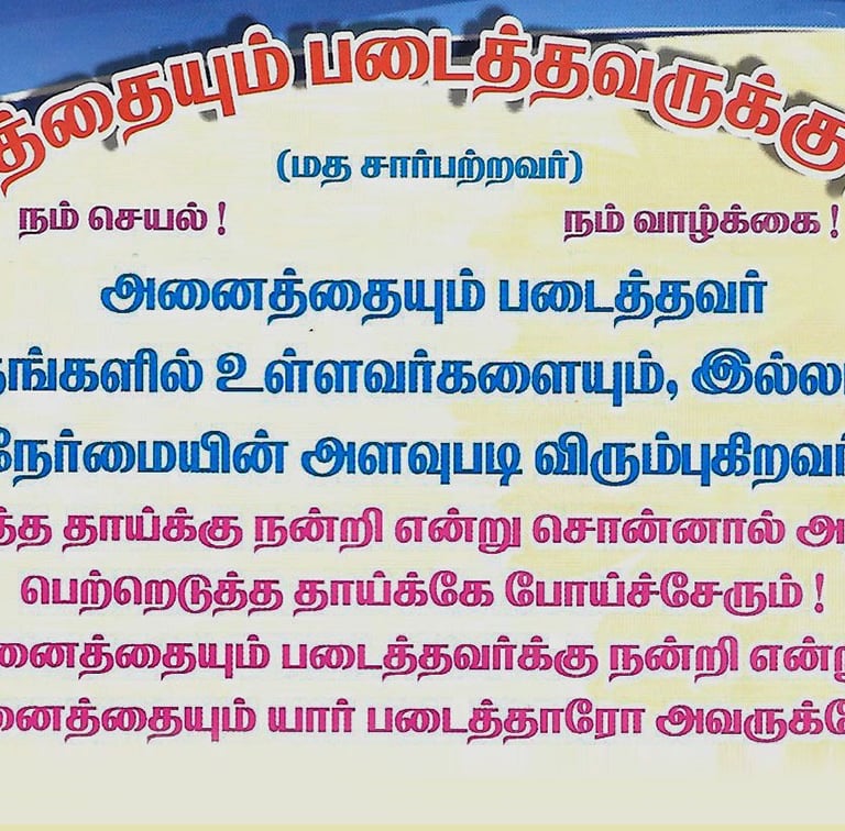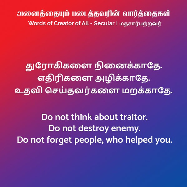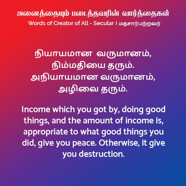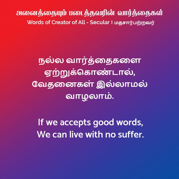 The 'Creator of All' (Secular) does not ask people to worship instead truly want is for people to live together with honesty. 'Creator of All' has given rain, air, and light freely to all living beings without any difference. This is a blessing for every human and every creature show thanks by living together in peace. The'Creator of all' (Secular) wants everyone to help each other as much as possible, without expecting anything in return—living with honesty, happiness, and unity. With honest people, the 'Creator of All' (Secular) stays as a companion in every situation. Those who correct themselves and choose to live as good people are forgiven, and their good wishes are supported. The 'Creator of all' (Secular) has given knowledge to everyone. But if someone uses that knowledge in the wrong way and keeps doing bad things, the 'Creator of all' (Secular) will not help them—and that is the truth.