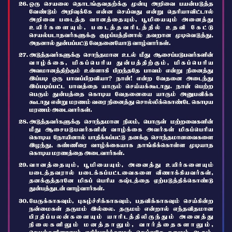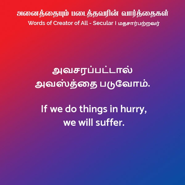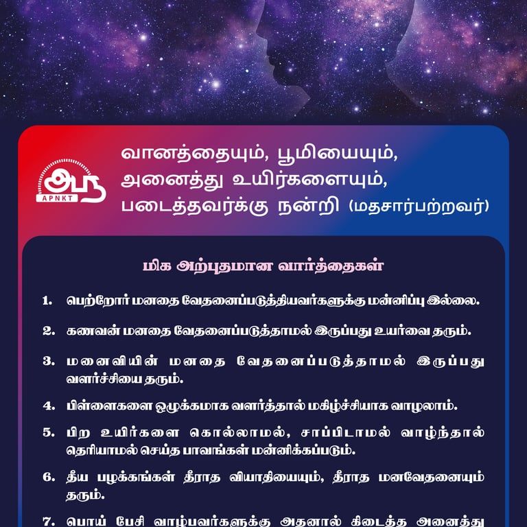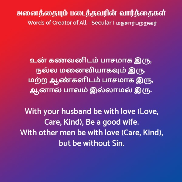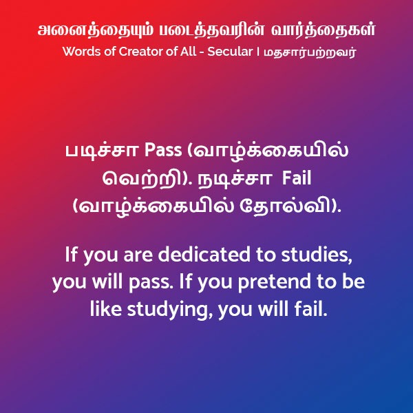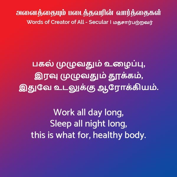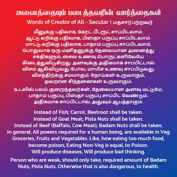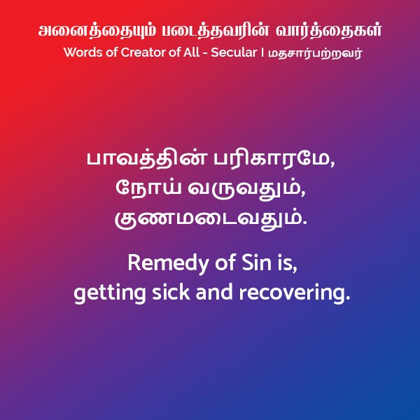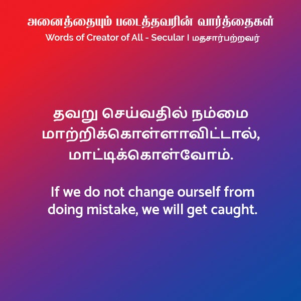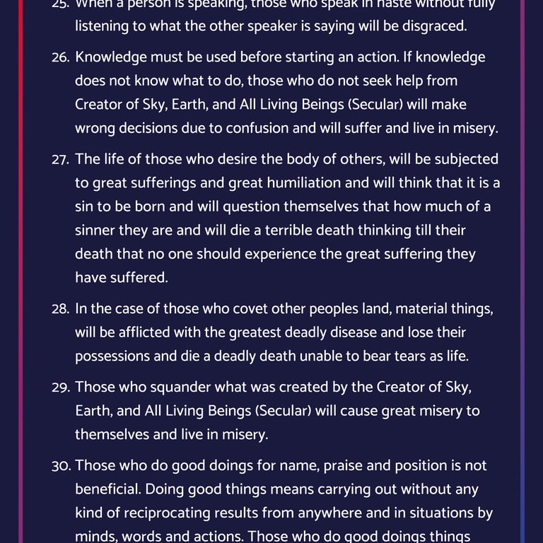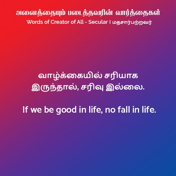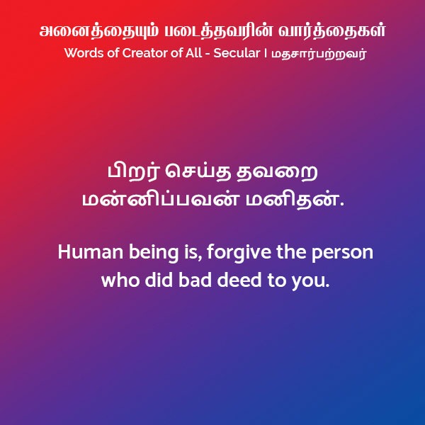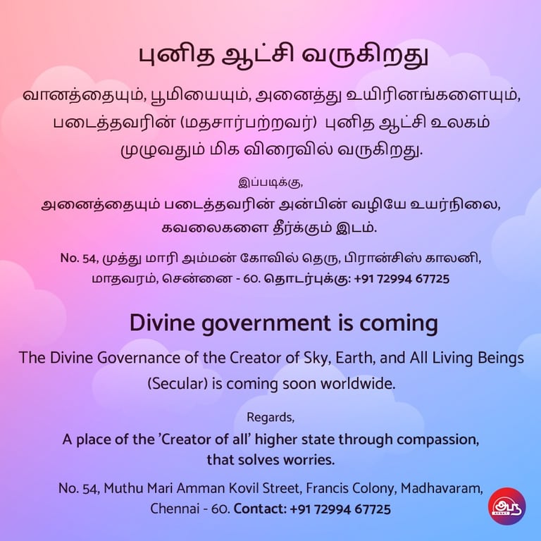 The 'Creator of All' (Secular) does not ask people to worship instead truly want is for people to live together with honesty. 'Creator of All' has given rain, air, and light freely to all living beings without any difference. This is a blessing for every human and every creature show thanks by living together in peace. The'Creator of all' (Secular) wants everyone to help each other as much as possible, without expecting anything in return—living with honesty, happiness, and unity. With honest people, the 'Creator of All' (Secular) stays as a companion in every situation. Those who correct themselves and choose to live as good people are forgiven, and their good wishes are supported. The 'Creator of all' (Secular) has given knowledge to everyone. But if someone uses that knowledge in the wrong way and keeps doing bad things, the 'Creator of all' (Secular) will not help them—and that is the truth.